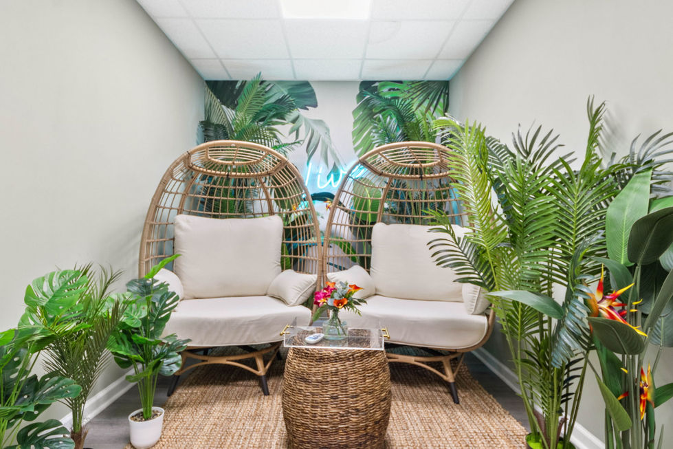 Surrounded by tropical trees and soft, nature-inspired tones, this cozy two-seater space features wicker egg chairs, a woven rug, and a glowing turquoise sign that sets the mood. Warm, inviting, and full of personality, it's the perfect hideaway for laid back chats and vibrant creativity. Setting the scene for authentic conversations and easy island energy. Designed for an intimate two-seater setup, this tropical hideaway brings warmth, style, and inspiration to every recording.